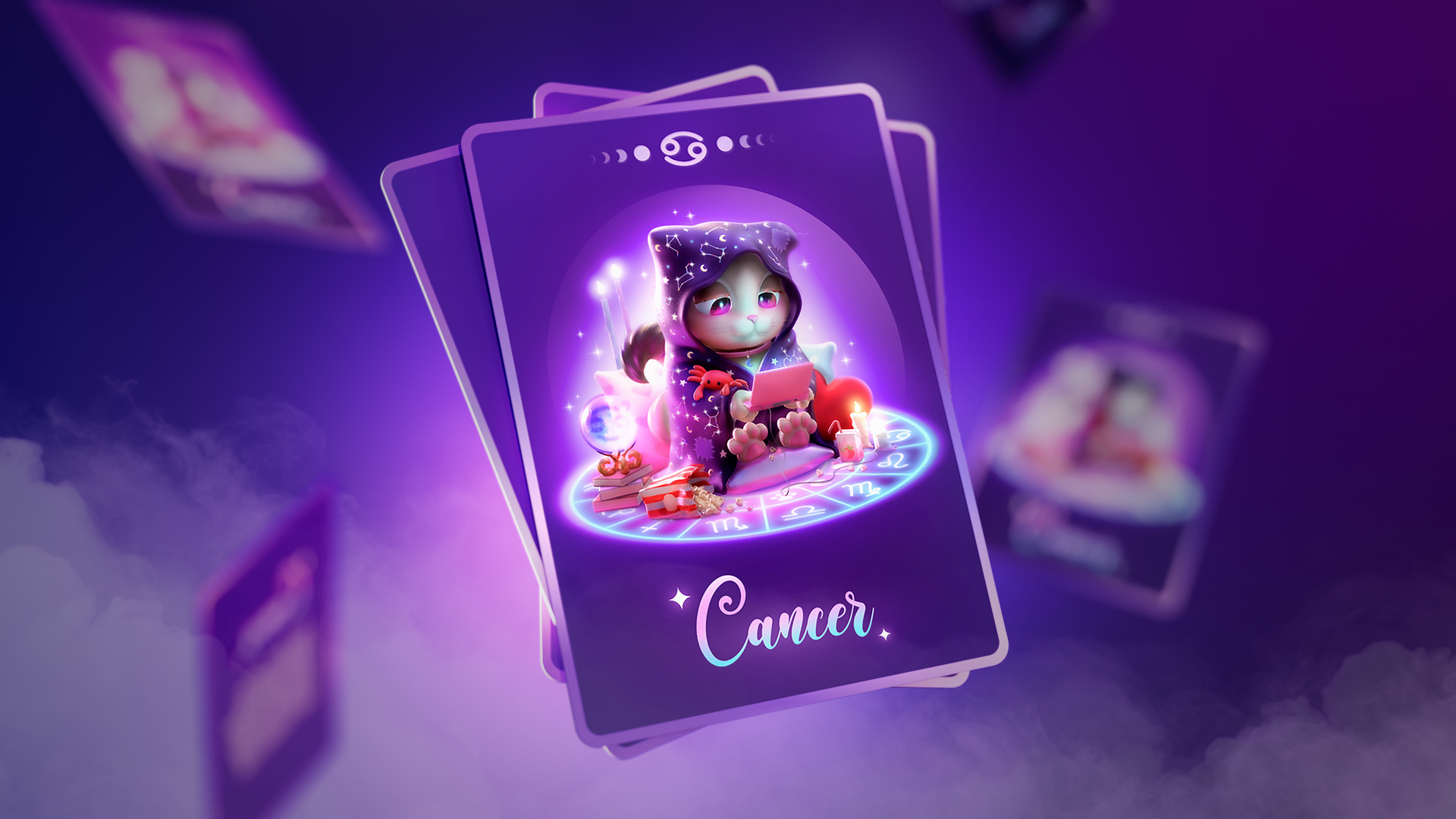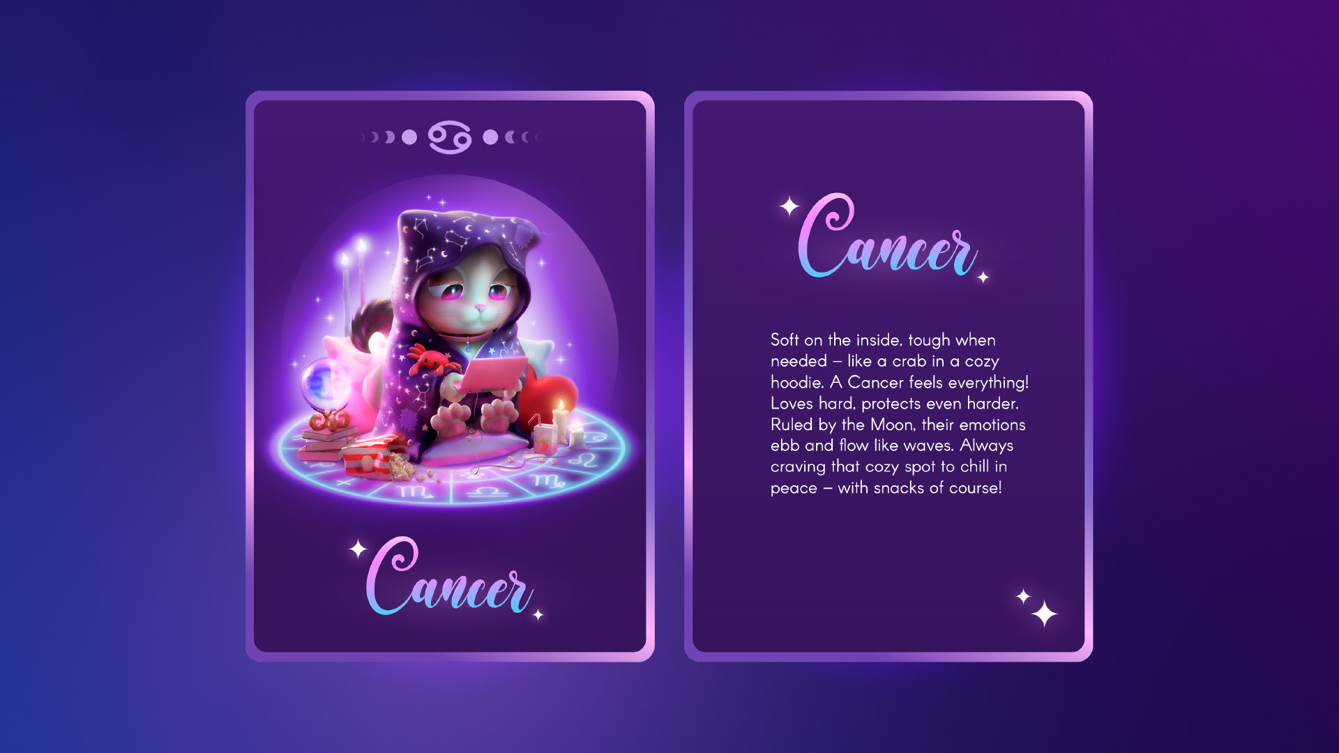 A zodiac-themed 3D illustration inspired by the Cancer sign, turned into a mystical tarot card.