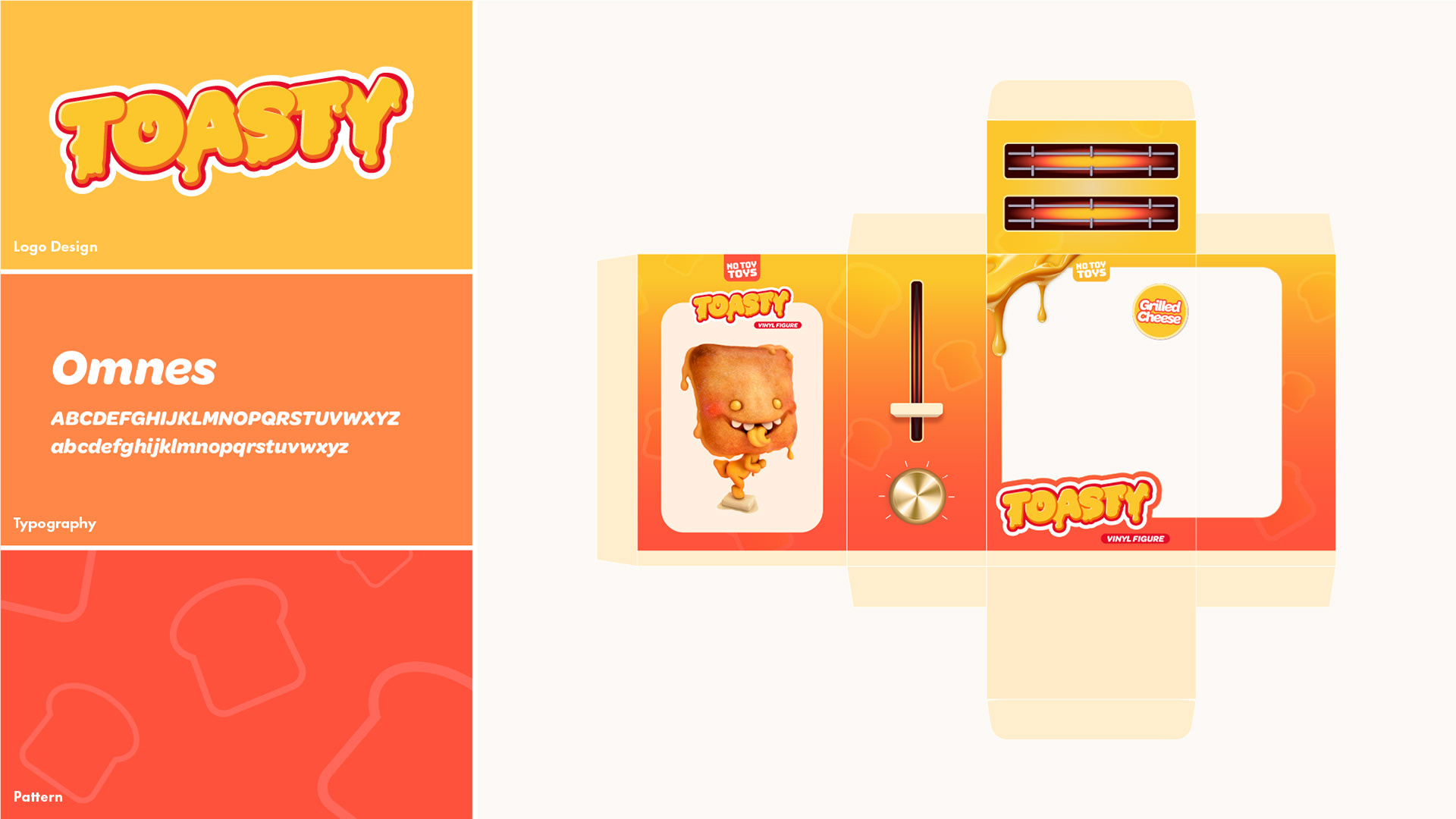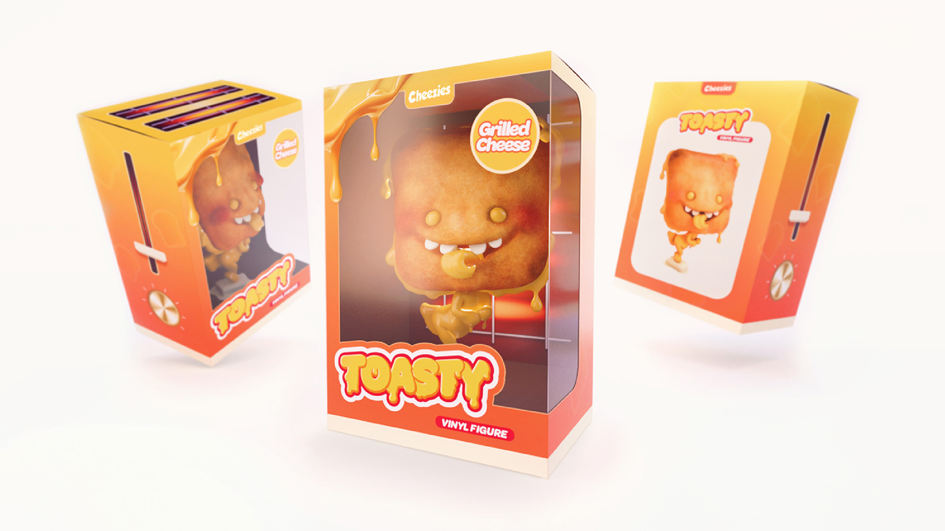 For the packaging I went with a toaster-themed design matching the character’s humor. The logo is styled to look like melted cheese, helping tie the concept together and give the packaging a fun, playful feel.